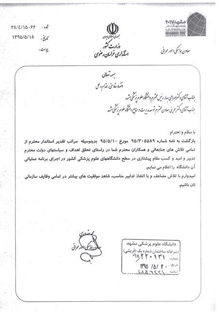 معاون هماهنگی امور عمرانی استانداری خراسان رضوی از رییس و معاون توسعه مدیریت و منابع دانشگاه علوم پزشکی مشهد در کسب مقام پیشتازی در مدیریت عملکرد سال 1394 تقدیر نمود. به گزارش وب دا، مهندس محمد مقدوری معاون هماهنگی امور عمرانی استانداری خراسان رضوی طی نامه ای از تمامی تلاش های دکتر مهرابی بهار رئیس دانشگاه علوم پزشکی مشهد و نیز دکتر بحرینی معاون توسعه مدیریت و منابع دانشگاه و همکاران ایشان در راستای تحقق اهداف و سیاست های دولت تدبیر و امید و کسب مقام پیشتازی در سطح دانشگاه های علوم پزشکی کشور در اجرای برنامه عملیاتی سال 94 تقدیر و تشکر نمود. وی ابراز امیدواری کرد با تلاش مضاعف و با اتخاذ تدابیر مناسب، شاهد موفقیت های بیشتر در تمامی وظایف سازمانی باشیم. |