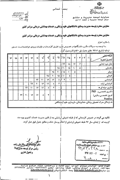 به گزارش روابط عمومی معاونت توسعه مدیریت و منابع، رئیس مرکز توسعه مدیریت و تحول اداری وزارت بهداشت، درمان و آموزش پزشکی طی بخشنامهای نحوه تطبیق کارمندان در طبقات ورودی را از تاریخ 96/1/1 ابلاغ نمود. شایان ذکر است در این ابلاغیه آخرین تغییرات مربوط به طبقات اعلام گردیده است. |